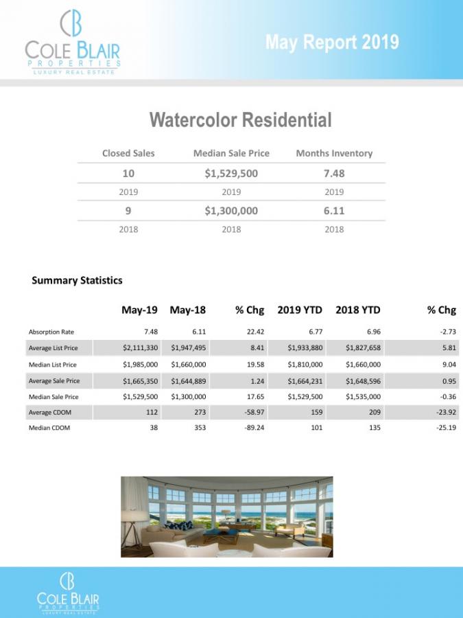 30A West had 54 closings vs. 53 and a whopping 56 pending vs. 39 compared to May, 2018. Median days on the market however rose substantially by 85% and for the year is up 37.88%. So interestingly, sales, especially pending, are strong yet it is taking longer for listings to move. Active listings are way up by 24.2% year-over-year and this potentially is impacting days on market with more choices as buyers take time to evaluate options.