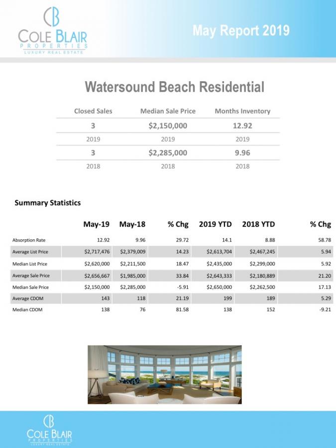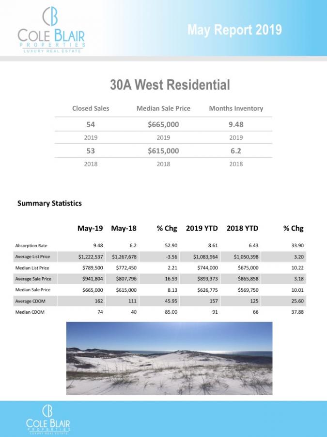 30A East had 110 closings vs. 116 and 106 pending vs.103 compared to May, 2018. Median days on the market fell 40.45% year-over-year and is down 22.31% year-to-date. Properties on 30A East are selling faster. Active listings are just about where they were this time last year, down a slight 1.5%.